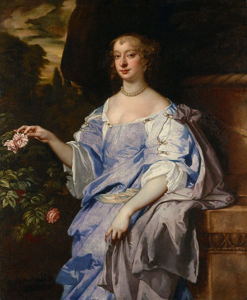 Curator: Up next, we have what is believed to be "Mary Ruthven, Lady van Dyck" by Anthony van Dyck, executed in oil paint. It's quite striking, isn't it? Editor: It is. I'm immediately drawn to the almost theatrical lighting. See how it dramatically highlights the sheen of her satin dress and the pearls? It feels opulent. Curator: Opulence fueled by access to luxury goods; in Van Dyck's era, things like silk, pigment for that glorious blue, and pearls, represented considerable capital. Look at her hands, carefully posed with what looks like a prayer bead; the leisure of the upper classes. Editor: Absolutely, but beyond its economic implications, the visual texture is so carefully constructed! The way the light catches the folds of the fabric creates movement. Notice how the dark background throws her features into high relief, and how van Dyck juxtaposes that dark background to the vibrant blues. Curator: Right. Van Dyck's workshop obviously had access to high-quality materials, the result being colors and textures designed to showcase his patron's wealth and status through sumptious fabrics and fine jewelry. Consider also, the societal norms requiring such portraits. Editor: The subtle variations in skin tone achieve a sense of volume and depth, contributing to an incredibly lifelike depiction, doesn't it? Van Dyck expertly uses a limited palette to bring forth an arresting immediacy. Curator: Indeed, but what’s fascinating is how portraiture as an industry perpetuated this elite vision; skilled labor crafting idealized likenesses circulated as status symbols within a specific social class, reinforcing hierarchies. Editor: Fair point. Although one must admit that Van Dyck manipulates light, shadow, and color to create an engaging surface dynamic that keeps the viewer's eye moving across the composition. A superb painterly technique. Curator: Exactly! So next time you see such works, don't only appreciate their aesthetics, but think of their impact on maintaining very unbalanced social power structures. Editor: Ultimately, both perspectives illuminate this work's enduring visual power for centuries to come.
