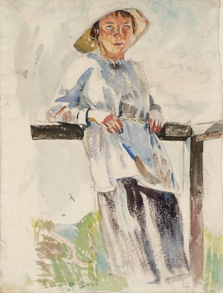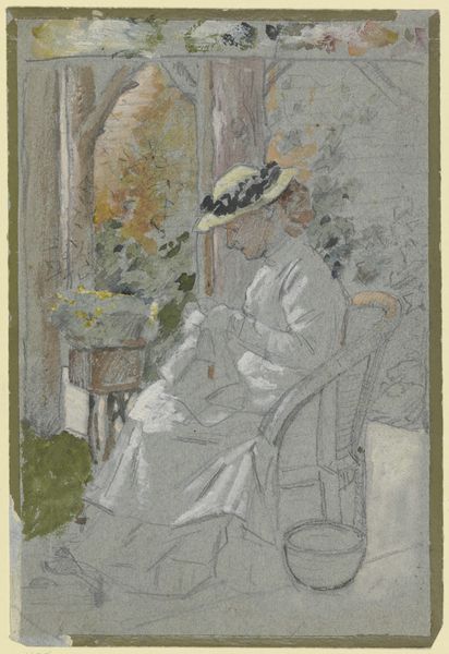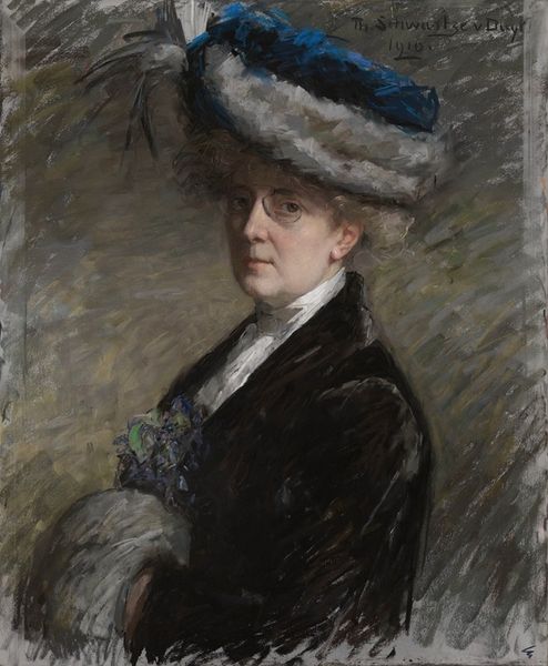 Curator: Immediately striking, isn’t it? There’s a muted intensity about her. Editor: Absolutely. It's like she’s caught in a fleeting thought, almost melancholic, enveloped by this hazy gray atmosphere. Gives her a kind of spectral presence. Curator: Indeed. This is Edouard Manet’s portrait of "Madame Edouard Manet," also known as Suzanne Leenhoff, his wife. Painted sometime between 1870 and 1876, using oil paints, we observe a departure from rigid academic portraiture. Note the swift brushstrokes, a hallmark of Impressionism creeping into Realism, capturing a sense of momentary existence rather than fixed identity. Editor: And that hat! It feels almost comically large, contrasting with her seemingly introverted disposition. But the dark, bold shape really does pull the eye doesn’t it? Makes you wonder what she's concealing, or perhaps amplifying. A theatrical flourish, maybe. Curator: Precisely. The stark contrast between the black hat and her pale face guides our reading. The composition utilizes what some call tonal painting, that restricted range of grays and blacks which creates visual cohesion. See how that lace collar dissolves almost into the background, flattening the perspective. Editor: Yes! And I think Manet uses that limited palette to enhance her…solitude, maybe? It’s as if he’s peeled away all the extraneous details, left us with the quiet essence of a person observing herself. Curator: It may signify something beyond simple aesthetics, too. The lack of adornment could serve as a rejection of bourgeois pretension, something we might expect of Manet, or possibly indicative of the subject’s internal landscape and a conscious attempt by Manet to represent character via visual forms. Editor: Possibly. To me, the painting whispers a sense of shared secrets and quiet understanding. As a viewer you feel invited in, a silent confidant to whatever contemplation has seized her mind. It lingers, this piece does, long after you’ve moved on. Curator: Yes, the painting resists definitive closure, presenting a fleeting and intimate moment. Its masterful brushwork and carefully constructed composition make it far more than just a depiction; it embodies mood itself. Editor: I am forever captured by the way the lack of resolution lets your imagination wander.