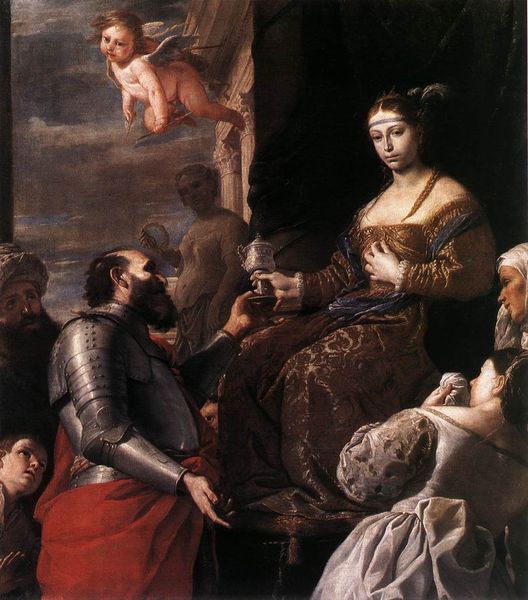 Editor: This is Gerard van Honthorst's "The Duet," painted in 1624 using oil on canvas. It's a wonderfully theatrical piece; the candlelight seems to almost leap off the canvas. What are your thoughts when you look at this work? Curator: The most compelling aspect for me lies in the deliberate display of wealth through materials. Observe the rendering of the fur coat, for instance, meticulously detailed to convey texture and volume. It signifies not just warmth, but status. And how is that illuminated and consumed? Editor: I see what you mean! The way the candlelight illuminates the fur really emphasizes its texture. Curator: Exactly! Honthorst exploits the light source not merely for dramatic effect, but to highlight the commodity and thus social currency represented by the fur. The artist, therefore, becomes a documentarian of the elite's material possessions and lifestyle, while inviting critique. It asks, at whose expense? Editor: So you’re saying the focus isn't just on the joy of music, but also on the social and economic implications behind even something like enjoying a duet? Curator: Precisely. How were pigments acquired? Who manufactured the canvas? Where did this fur come from, and who profited? What conditions allowed for this leisurely scene to even take place? We must investigate labor, materials, and consumption within the Golden Age. Editor: I hadn't considered those questions. I'm beginning to see how even seemingly straightforward portraits can be so rich in material context! Curator: Indeed! By scrutinizing the tangible elements within a piece like "The Duet", we unravel a far more complex narrative, of wealth, and inequality.