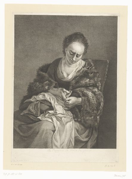 Michael Schnell created this print, *Brieflezende jonge vrouw*, or *Young Woman Reading a Letter*, sometime in the 18th century using an etching technique. The print is structured around a soft, diffused light that gently models the figure of the young woman and the objects around her. Schnell employs a delicate balance of light and shadow. The composition directs our focus to the letter, emphasizing the act of reading as a moment of introspection and connection. We might interpret the image through structuralist lenses, observing how the act of reading—decoding symbols into meaning—mirrors the viewer’s experience of the artwork itself. The letter functions as a signifier of emotions and relationships, its contents unseen yet powerfully present. Ultimately, it invites us to consider how the communication of emotions and personal narratives, visually and textually, shapes our understanding of the world.