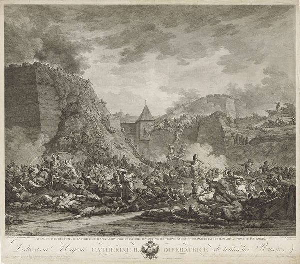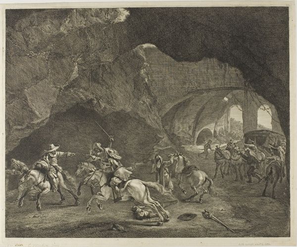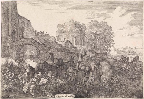 Cornelis Visscher’s etching, *The Large Lime-Kiln,* captivates with its intricate rendering of light and shadow. The architectural structure dominates the composition, its imposing form softened by the activity of the figures around it. The contrast between the kiln’s geometric solidity and the fluid lines of the landscape creates a striking tension. Visscher uses hatching and cross-hatching to build depth, drawing our eye from the foreground figures to the distant buildings. The kiln itself, a symbol of transformation, becomes a stage for human activity. The artwork can be read as a semiotic field. The kiln represents industry, while the figures suggest a social hierarchy, their actions and positions hinting at underlying power dynamics. The print invites us to consider how architecture shapes human experience and how industry transforms the landscape. It does this not through explicit narrative but through the interplay of form, light, and texture.