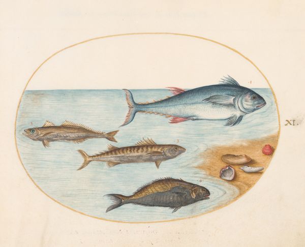 Joris Hoefnagel rendered this watercolor around 1575-1600, showcasing various fish, including catfish and salmon. The fish are carefully depicted within a defined aquatic space, their forms and textures meticulously studied. The catfish, with their barbels, immediately call to mind ancient river deities from Mesopotamian art, where fish were sacred symbols of fertility and the primeval waters. Think of Oannes, the fish-god emerging from the sea to impart knowledge to humanity. This motif resurfaces in different guises across cultures, adapting to local contexts. The fish as a symbol is deeply embedded in our collective unconscious, reflecting themes of transformation, mystery, and the abundance of the natural world. Hoefnagel's rendering, while seemingly a scientific study, taps into this primal connection, evoking a sense of wonder and perhaps a deep-seated, subconscious recognition of our shared origins. These images capture nature’s power, continuing a tradition of conveying potent emotional and symbolic meaning.