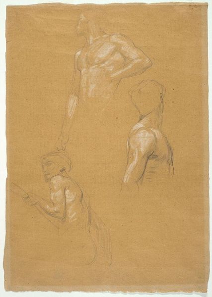 Józef Simmler created these nude studies in pencil, as preparatory sketches for figures in his painting, 'The Immaculate Conception of the Blessed Virgin Mary'. The composition features two male figures kneeling in prayer, their bodies rendered with delicate lines and subtle shading. Consider the formal qualities of this sketch. Simmler’s choice of graphite allows for a nuanced exploration of light and shadow, which define the musculature and contours of the figures. The kneeling posture is captured from different angles, allowing Simmler to meticulously study the body's form and spatial relationships. The use of the nude form relates to academic traditions of anatomical study, yet it also introduces a layer of classical idealization into a religious context. This interplay between the classical and the religious is suggestive of the ongoing dialogue between artistic conventions and theological narratives in 19th-century art.