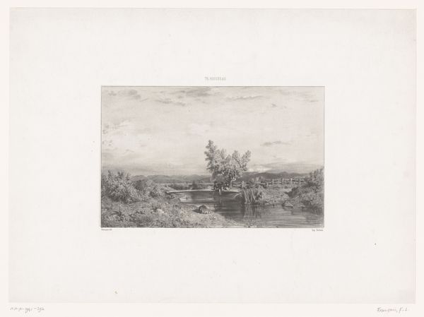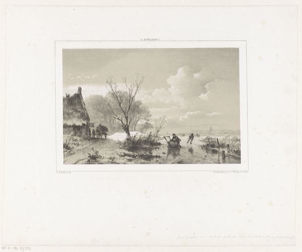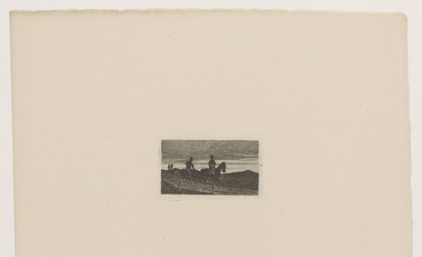 Curator: This is "Company on the Heath," dating roughly from 1846 to 1863, by Hendrik Adriaan Christiaan Dekker. It combines etching, drawing, and printmaking techniques. Editor: It's quite bleak, isn't it? A somber landscape, full of greys. The composition feels divided—figures gathered to the left, agricultural work on the right. Curator: Dekker captures a pivotal moment in the Dutch countryside. Consider the heath itself—not just a picturesque backdrop, but a site of labor, resources, and contested ownership. The materials would have been readily available at the time. Editor: I see how the choice of medium plays into that narrative. The etching, drawing and print processes would make it highly reproducible, disseminating an idealized version of rural life. The elite visiting this community in their dark jackets reinforces the power dynamic of its distribution and consumption. Curator: Exactly. Romanticism often glossed over the harsh realities of agricultural life. Dekker's choice of etching and print, with their capacity for detailed line work and shading, reveals an intense process of planning. But also notice the style reminiscent of a genre-painting. Editor: What about the landscape, then? It isn't simply a background. The muted palette could speak to the political turmoil of the era, and their relation to access to goods and resources. Curator: Absolutely, especially in terms of consumption! The limited tonal range forces us to focus on the land itself, prompting questions about its utilization and social value during a period of massive agrarian shifts. The artist creates a discourse of social change and continuity. Editor: Indeed. So, on the surface, a pastoral scene. But peel back those layers and a complex story about labor, resources, and the politics of representation emerges. Curator: Precisely. A reminder that even seemingly idyllic scenes are products of social and material forces. Editor: Making it an image that invites critical reflection, especially for a modern audience aware of environmental and labor concerns.