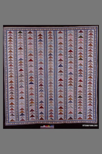 Curator: Before us hangs the "Bedcover" by Bertha Green, crafted around 1935. The piece employs mixed media, specifically fiber art and textile techniques, primarily utilizing cotton. Editor: My first impression is the geometry. The regular grid punctuated by colorful squares against the light backdrop evokes a serene sense of order. Curator: Indeed, the geometric pattern dominates. One might view it as a study in minimalist structure, its repetition and simplicity creating a visual language that speaks to basic artistic forms. Consider how the lines interact, creating distinct negative space. Editor: And yet, for something so ostensibly rigid, there's a tactile quality that beckons. Imagine the hours poured into its construction, the hand that stitched each piece, making what may seem like simple geometry into something far more complex and meaningful. Curator: True. A Formalist reading appreciates the pure visual form. But acknowledging the material labor transforms the analysis. We see beyond geometry to the means of production itself, a tangible connection to the human element in this supposed abstraction. The material signifies labor. Editor: Exactly. It asks, "Who was Bertha Green, and what were the conditions under which she crafted this textile?" It's not merely pattern and structure, it's a relic of a life lived, stitches imbued with the values and experiences of its creator. Curator: Fascinating. You've successfully widened my view of the piece. The intersection of its visual formalism and tangible material reality makes for a richer understanding. Editor: I’m glad we could consider both aspects of this artwork, where formal precision merges seamlessly with lived experience through meticulous labor.