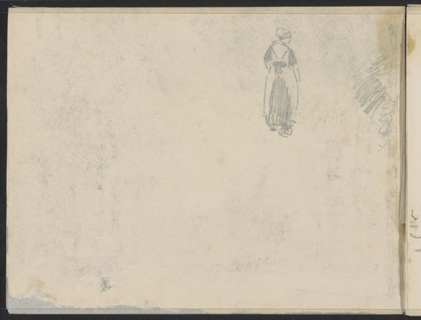 Curator: This pencil and charcoal drawing, "Vrouw met een voorwerp in haar handen, mogelijk een emmer" – "Woman with an object in her hands, possibly a bucket" – was created around the 1880s by Willem Witsen and now resides in the Rijksmuseum. Editor: I love how sparse it is! The empty space kind of hums, doesn’t it? Like a whispered secret. I’m immediately struck by the woman's stillness, her anonymity, and, honestly, a sort of melancholic beauty. Curator: Melancholy, absolutely. Consider the historical context: late 19th-century Netherlands. We are amidst immense social changes, industrialization, and urbanization disrupting traditional ways of life. Witsen, aligning with the Hague School, often depicted everyday life, especially its more somber aspects. The woman's stance, averted gaze, could represent the burdens faced by working-class women. Editor: A burden, yes, you see it in the slump of her shoulders and also the shadow, or rather, lack of shadow...she seems to have no dimension in this existence of hers. Curator: The lack of detail actually amplifies that feeling, doesn't it? Witsen focuses on form and light rather than precise features, universalizing her experience, she almost ceases to be a real women here. Editor: Yes! It feels as if she belongs to a world of quiet resignation, perhaps carrying burdens both physical and emotional. Curator: And there’s a socio-political dimension to this "quiet resignation," think of labor exploitation during the Dutch Golden Age, also the intersectional oppressions facing women in that social context. Her stillness then transforms into an act of resilience or perhaps an unintentional consequence of the systems she navigated. Editor: Or maybe she’s just off to get some water, hahaha! That's the beauty, though, isn’t it? An open question. It really encourages our interaction with the scene; it allows us to dream our own reality onto the sparse strokes of this humble charcoal. Curator: And it's in that engagement, connecting to those realities across time, that art truly lives. Editor: Beautifully put. I guess it’s all about what bucket we are drawing from.