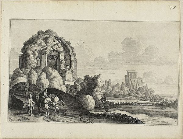 Curator: This is Giovanni Battista Mercati's delicate etching, "Sta. Agnese, Rome," created around the mid-17th century. Editor: It strikes me as a study in contrasts; the ruin on the left is so stark, juxtaposed against the meticulously rendered church in the distance. Curator: Indeed. That ruin carries echoes of the Roman Empire. The church, of course, represents the triumph of Christianity. Mercati uses that visual tension to speak to the city's layered history. Editor: The line work is fascinating too. Note the controlled hatching—almost mathematical—to define form and shadow. It lends a sense of gravity despite the small scale. Curator: And the inclusion of a figure on the lower right, almost as a witness, reinforces the enduring human presence within the landscape, a continuous narrative. Editor: The composition itself tells a story of decline and rebirth. The artist uses architectural forms as metaphors for the cyclical nature of civilization. Curator: Mercati encapsulates the essence of Rome—a city built on layers of memory. Editor: A powerful visual meditation on history, conveyed with incredible precision.