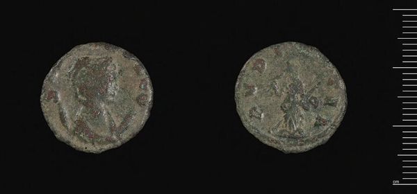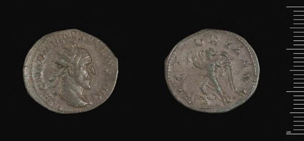 Editor: This is an Antoninianus coin of Trajan Decius, a Roman emperor. It's amazing to think of the history held in such a small object! What do you make of the imagery here? Curator: The Emperor's portrait, and the figure on the reverse, aren't simply representations. Consider them as symbols of power, prosperity, and Roman virtue. How do these images communicate the Emperor's desired image? Editor: So, the images were designed to project authority and influence? Curator: Precisely. This coin served as a constant reminder of the Emperor's presence and the ideals he wished to embody, circulating beliefs as much as currency. Editor: It’s fascinating how symbols on something so small could carry such weight. Curator: Indeed, it's a powerful lesson in how images shape perception and power.