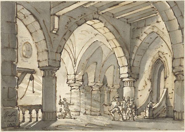 Curator: Let’s discuss Louis Conrad Rosenberg's 1927 etching, "Fountain of Aya Sophia, Constantinople". My immediate impression is one of reverence, a feeling of hushed awe inspired by this place. Editor: I'm struck by Rosenberg’s evident engagement with architectural spaces through the etching process. The dense, almost frantic, network of lines meticulously capture light reflecting on the fountain's materials and its spatial environment. We have a strong interplay between labor and place in the physical details here. Curator: Yes, the repetition of archways certainly builds a powerful symbolism, drawing the eye toward the detailed fountain, which functions almost as an altar within the architecture. Notice how that ornate fountain becomes the focal point. It embodies cultural memory, referencing the ablutions that mark sacred space in the Ottoman era. Editor: Consider the context here though, the very process of creating this etching highlights the accessibility and distribution of such imagery. An etching allowed for mass production, engaging new audiences with visual depictions of specific architecture while democratizing cultural images, transforming them from singular objects into mass culture experiences for consumption. Curator: Good point, as this work highlights both physical devotion and artistic circulation. Beyond the implied religious practices and aesthetic wonder, the etching's stark monochromatic presentation really underscores a specific kind of architectural legacy that remains culturally significant. I am interested in those lasting elements... Editor: And I'm thinking that each line represents labor— the intense craft and intention poured into depicting not only this scene but also engaging and critiquing art's place within society as a mass produced object and as a tool of material culture. So much intention, process, labor embedded here. Curator: Indeed, a wonderful combination of spiritual resonance and material ingenuity to be found in this work, wouldn't you agree? Editor: Yes, the way Rosenberg engaged process is thought-provoking, leading us to ponder the intersection of material consumption and architectural space as well as how buildings take on different significations across cultures through process itself.
