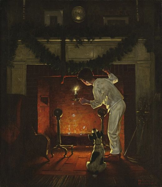 Curator: This painting, rendered in oil paint, is titled "Stealing Socks" by Norman Rockwell. Painted in 1928, it actually functioned as an advertisement for Interwoven Stockings. The subdued colors create a rather mysterious mood. Editor: Indeed. At first glance, I feel a palpable sense of domesticity tinged with an illicit act, something sly and possibly a bit naughty. There's a voyeuristic quality too, perhaps even challenging conventional ideas about class. Curator: Considering the historical context, remember Rockwell was known for reflecting the socio-cultural norms of American life. The seemingly simple act of sock "theft" speaks volumes about consumerism and perhaps, access in the 1920s. His work often presents an idealized view, but can it also imply a disruption of gender norms? A subversion of masculinity in service of fashion? Editor: It’s fascinating to interpret the potential social narrative interwoven, excuse the pun, within this commercial image. The figure, his gaze focused downwards, seems almost embarrassed. Rockwell consistently explores a wide range of identities within society and perhaps this picture is part of that analysis, despite being made to sell hosiery! The positioning of this advert and to whom it spoke within a social hierarchy is very relevant. Curator: That’s right. Museums and galleries elevate pieces from mere commerce to significant cultural artifacts. This work moves from a simple illustration of consumer product towards reflecting shifting identities within the context of interwar US, where race and social-class divisions played a prominent role in dictating cultural values. Editor: It's easy to dismiss this image, originally created to sell merchandise. But by doing that, we miss an opportunity to explore how social structures can dictate the way in which individuals understand each other's realities. Acknowledging all factors, not only what is immediately obvious or has already been said, provides a fuller analysis.
