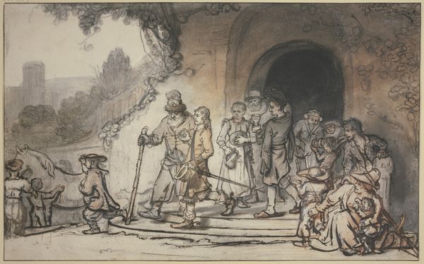Alexander Ver Huell made this watercolor, titled 'Terugkeer van een gewonde soldaat', which translates to 'Return of a Wounded Soldier'. Painted in the 19th century, the image invokes the complex relationship between the wounded body and constructions of masculinity. The central figure is a soldier, his arm draped over the shoulder of another man for support. Yet, his gaze is downcast, his body weakened, challenging traditional representations of soldiers as stoic heroes. The artist invites us to consider the emotional and physical toll of war. What does it mean to return not in triumph, but in need? Here, vulnerability is on display, a stark departure from idealized portrayals of martial strength. In this disruption of norms, Ver Huell opens a space to recognize a fuller spectrum of human experience.