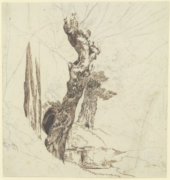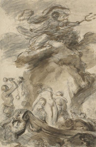 Curator: Salvator Rosa, an artist working in seventeenth-century Italy, created this evocative drawing entitled "St. Paul, Hermit." Editor: My first impression is raw energy—it feels like the landscape itself is praying. The figure seems almost fused with the trees and rock, and the ink work is so dynamic. Curator: Rosa often challenged artistic conventions. By depicting St. Paul, a significant religious figure, in such a wild and untamed natural setting, Rosa perhaps comments on the place of the church within a changing, turbulent social and political landscape. Editor: Absolutely. And it’s worth considering Rosa’s handling of materials. The combination of ink and charcoal—they have different properties. The ink allows for fluidity and ethereal washes, while the charcoal provides the dense blacks for those really textural passages of tangled hair and branches. It's like he's investigating the haptic qualities of mark-making. Curator: Also interesting is the accessibility of drawing itself. Unlike large-scale oil paintings, drawings could be produced relatively quickly and circulated amongst a wider audience, furthering Rosa's public visibility and reputation. Editor: Yes, it raises questions about the labor involved. This isn't about the opulent display of expensive pigments, but rather a more immediate engagement with readily available materials, something almost anyone could do. I wonder about the kind of paper, too; its absorbency would affect the behavior of the ink. Curator: I agree; the support and materials clearly lend themselves to the raw aesthetic we see, adding to a general sense of pious humility. Consider the contrast between this unidealized figure and the perfect musculature seen on sculptures or idealized paintings of gods. The meaning, after all, is generated as much by these contextual considerations, artistic background, and exhibition environment. Editor: It’s true; while religious, it’s about human connection to the elemental power of nature, using a really immediate and democratic set of materials to create that impact. Curator: Indeed, Rosa's vision resonates even today because of its dramatic use of both the artistic process and its social commentary. Editor: The rough-hewn character really invites a sort of profound respect and contemplation of material culture.