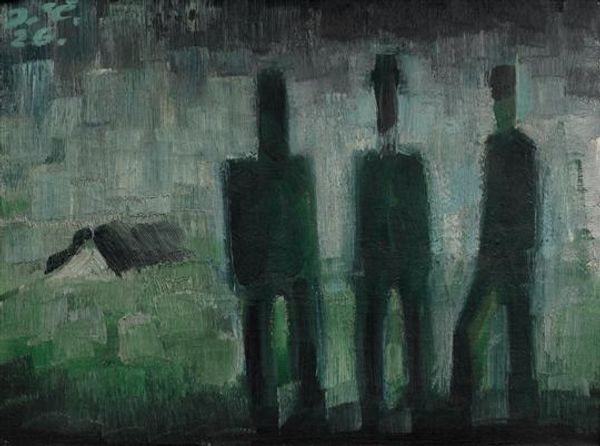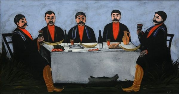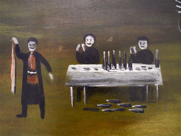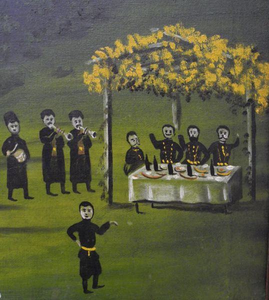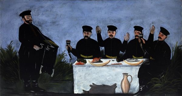 Curator: Here we have Niko Pirosmani’s "Donkey Bridge (fragment)", rendered in oil paint, depicting what appears to be a lively, albeit cropped, genre scene. What strikes you initially about this composition? Editor: The immediacy of it, honestly. The raw, almost primitive handling of the oil paint. The forms are so simplified; it feels incredibly direct, like looking at folk art. You really get a sense of the artist's hand. Curator: That immediacy speaks to Pirosmani's self-taught nature. But that directness also amplifies the archetypal feel of the imagery, doesn't it? The figures around the table evoke a sense of fellowship, maybe a bit of revelry or an important social encounter, something deeply ingrained in Georgian culture. Editor: Right, and think about the implied labor—producing food, distilling spirits, weaving the tablecloth—all unseen yet central to the image’s meaning. The simple repast tells a whole social story of sustenance and hospitality. I am wondering about that rough surface that the tablecloth has - what is that? Is it intentional? What is the materiality? Curator: Yes, I'm wondering what you make of their attire - It suggests perhaps a clerical order celebrating some occasion? And note their raised hands, the gestures carry significant social meaning in that region. Editor: I'd venture that this painting is a reminder of the unseen networks that support communal experiences. Curator: A fantastic point! Considering Pirosmani's own background as a largely itinerant artist, the depiction gains layers of significance, highlighting the material conditions necessary for such gatherings, but more importantly, those that create the shared experiences he wanted to create in paint. Editor: Absolutely, so much weight carried within such seemingly simple materials. I feel my appreciation has only been expanded. Curator: As has mine, witnessing the dialogue between material existence and symbolic celebration—a resonant pairing, beautifully illuminated by Pirosmani’s brush.