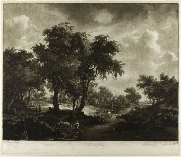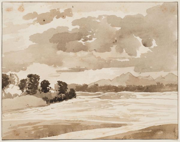 Curator: Looking at this piece, I immediately feel a sense of calm and solitude. It's so delicately rendered. Editor: This is "Landschap met links bomengroep" or "Landscape with Trees on the Left", created in the 19th century by Remigius Adrianus Haanen. It is executed in watercolor on paper. Curator: The composition really directs the eye. See how the artist places the group of trees on the left, anchoring the scene? And then that gentle recession into the distance. It’s all very carefully calibrated. I am immediately drawn into this image. It exudes this quiet sort of power, almost brooding. Editor: Haanen was clearly working en plein air, directly from nature. These landscape drawings were very important in establishing the Romanticism movement's emphasis on direct engagement with the natural world. What we now consider the rise of plein-air tradition came from artist using these methods for quicker and more efficient documentation. Curator: Notice how the color is mostly monochrome, a limited palette. He varies his application of the paint, building up darker tones in the foreground that subtly guides you towards a softer grey tonality in the distance to add to the overall feeling. Editor: Indeed, and that subdued color palette has its own history, certainly. Remember, academic painting often dictated bright, historically accurate colors. Haanen’s choice here suggests a retreat from those strictures. Landscapes provided more opportunity for personal expression, away from social narratives. It moves beyond just depicting space to presenting one’s view, one’s spirit in direct relation to the natural world. Curator: It’s interesting that the AI identified an element of surrealism! Maybe that reflects the almost dreamlike quality of the subdued palette? Or even just how the shapes interact between organic elements? Editor: Possibly. The interpretation and categorization by AI often reveals more about its programming biases than the artwork. Yet it serves to emphasize how works are ever moving targets for changing contemporary frameworks. It does help highlight some emotionality through line and shading. Curator: A reminder of the constant, shifting ground of meaning. I leave this artwork seeing more of what nature allows but also what we choose to accept from the images before us. Editor: An encounter like this is exactly what’s so vital; the artwork continues its story each time it connects with another soul across history.