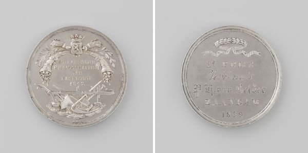 This silver medal commemorating the death of Queen Wilhelmina Frederica Louisa was made by David van der Kellen, a 19th-century Dutch medallist. What strikes you first is the composition of the medal. On one side, a draped female figure leans mournfully against a column, her gesture one of profound grief. The lines are soft, and the relief is subtle, creating a sense of depth within the small circular space. Opposite, the stark, geometric arrangement of text detailing the Queen's birth and death dates, framed by a border of stars, offers a visual counterpoint. In considering the medal's structure, we see a dialogue between classical allegory and precise historical record. The weeping figure, a conventional symbol of mourning, is juxtaposed with the unyielding clarity of the inscription. This contrast destabilizes any singular interpretation, inviting us to contemplate the interplay between public duty and personal loss. The medal becomes a site where history and emotion intersect.