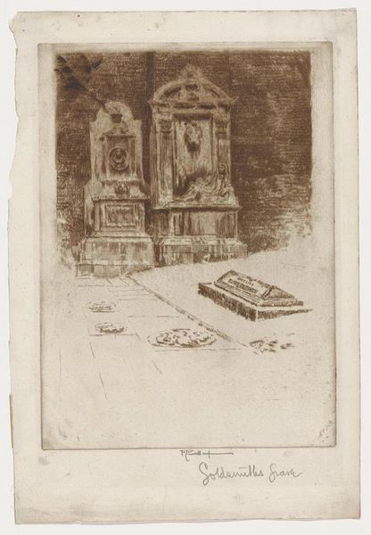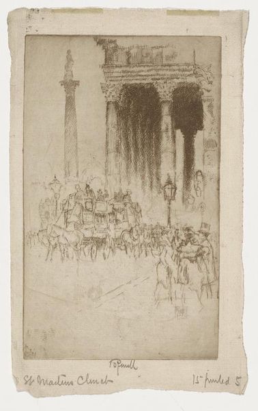 Curator: The Harvard Art Museums hold this etching by Donald Shaw MacLaughlan, titled "Lion Column". Its scale is rather intimate. What are your initial impressions? Editor: It feels melancholic, almost ghostly. The column looms large, but the wispy lines give it a fragile, transient quality. Curator: That resonates with the social function of monuments. They aim for permanence, but their meanings shift across time, reflecting evolving power dynamics. Editor: Absolutely. The lion atop the column, a symbol of authority, seems to preside over a blurred, indistinct cityscape. Is it a critique of power, or perhaps a lament for its inevitable decline? Curator: Perhaps it's about the precariousness of even the most entrenched symbols. A reminder that history is never truly fixed. Editor: A potent visual statement then about the interplay of power, memory, and the ever-changing urban landscape.