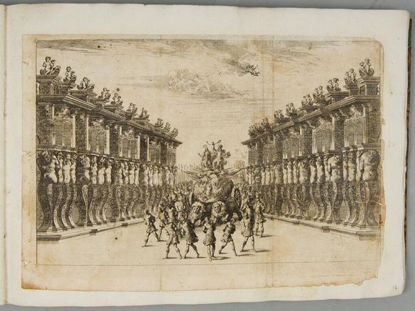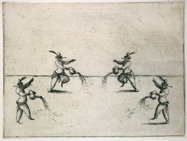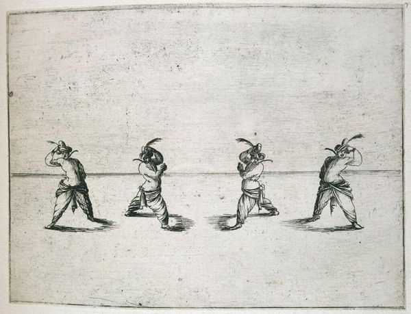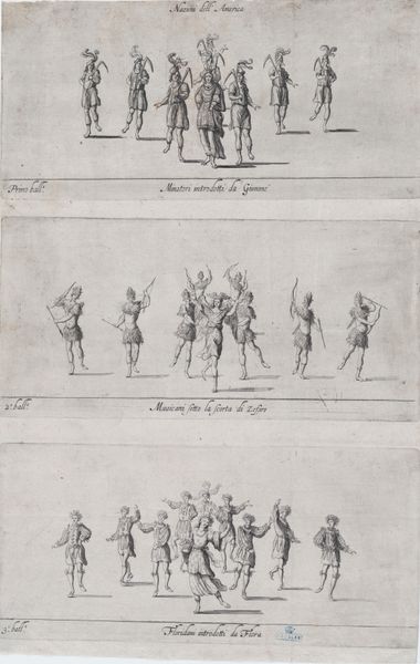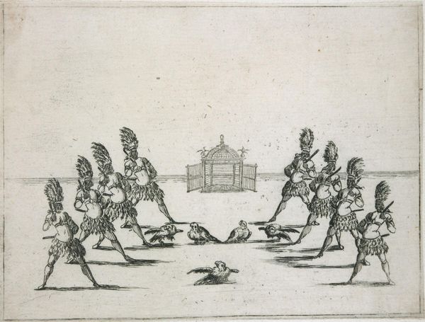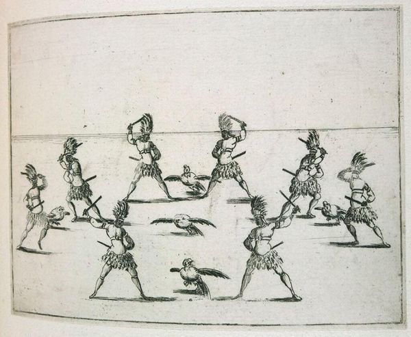 Curator: This is Valerio Spada's "Plate VI, Eight Parrot Dancers in a Circle, Their Parrots in Flight, from Ballet of Bears with Parrots, Ballet by Jean Baptiste Balbi for 'La Finta Pazza.'" Editor: It’s got such a playful, almost chaotic energy. The dancers and the parrots mirroring each other, all caught in this whimsical dance. Curator: The circle, a potent symbol. It evokes ritual, community, and the cyclical nature of life. Notice how the parrots themselves become extensions of the dancers' movements. Editor: Absolutely. And that stark contrast, the etched lines against the empty space, it creates a kind of dreamlike quality. Are they really there, these parrot people? Curator: These images were created for illustrated libretti, so these are records of performances combining elaborate stage design, music, and dance. A very synesthetic experience. Editor: It’s fascinating to think of this static image capturing such a dynamic moment in time, a fleeting performance now preserved in these lines. Curator: Indeed, it speaks to the enduring power of symbols to transcend time, even in ephemeral forms like ballet. Editor: Makes you wonder about the music, the costumes, the whole sensory overload of that original performance. This little etching is just a keyhole view into a lost world.