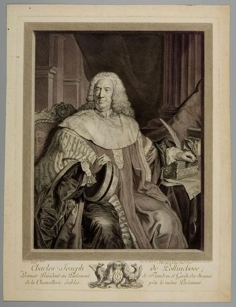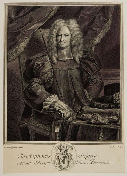 Editor: Here we have Bernhard Vogel's portrait of Johann Michael Welser. It's undated but Welser lived from 1628 to 1714. There is a lot going on; the frilly collar and wig are visually striking, but I'm also curious about the imagery at the base. What stands out to you about this portrait? Curator: Well, let's consider the context of portraiture in the 18th century. It was a powerful tool for projecting social status and political authority. Notice how Welser is framed by that oval cartouche, like a medal of honor. What does the inclusion of the cherub and coat-of-arms suggest about his social standing and aspirations? Editor: So it's not just a likeness, but a carefully constructed image intended to communicate power and legitimacy. It makes you wonder about the intended audience and how they might have interpreted these symbols. Thanks! Curator: Exactly. Thinking about the reception of such imagery really unlocks a deeper understanding.