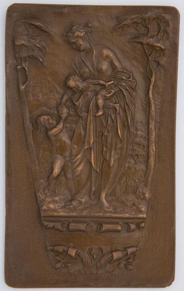 Editor: This bronze relief is called *Cupid as Honey Thief* and is by an anonymous artist. It's tiny, smaller than my hand, but the scene feels so dynamic! What strikes you most about this image? Curator: Notice how the artist renders Cupid, the god of love, not as an innocent babe, but a mischievous figure, disturbing the natural order. What does the theft of honey imply about love itself? Editor: Maybe that love, like honey, is sweet but can also sting? Curator: Precisely. The mother figure, possibly Venus, seems to warn us of Cupid’s deceptive nature. The symbols are not merely decorative, they're cautionary tales. Editor: That's fascinating. I’ll definitely look at classical art differently now! Curator: Indeed. The beauty of art lies in its layered meanings, constantly reinterpreted across generations.