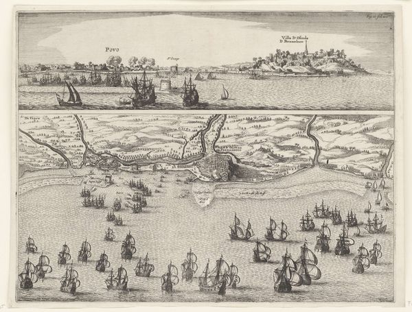 Claes Jansz. Visscher’s engraving, "Siege of Fort Mardijk, 1645," presents a compelling interplay of space and power. The composition is divided into distinct horizontal registers, each offering a different perspective on the siege. The top shows a telescopic view of the fort and the middle shows the ships approaching. The bottom register shows the siege and surrounding areas from the point of view of an aerial map. Visscher employs a bird's-eye view, flattening the landscape, but also giving a sense of the scale of the siege. This perspective transforms the landscape into a structured field of strategic importance. The lines of fortifications and troop movements create a visual language of control and resistance. The contrast between the detailed rendering of the fort and the more schematic depiction of the surrounding areas invites us to consider the relationships between place, power, and representation in times of conflict. It also emphasizes the importance of cartography as a tool for asserting territorial claims.