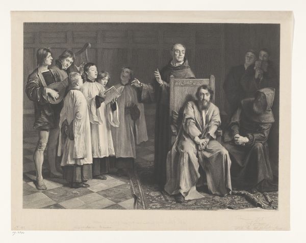 Editor: This print from 1791, "Judas brengt de zilverlingen terug" by Robert Dunkarton, depicts a scene of high drama with strong contrasts. It’s so Baroque in its intensity. What socio-political factors might have influenced its creation and reception at the time? Curator: That's a great question. Think about the context of printmaking at the end of the 18th century. Engravings like these played a crucial role in disseminating imagery to a wider public. How do you think an image like this, with its strong moral message, functioned in the public sphere? Editor: Well, it's religious narrative art, so it might serve as a didactic tool, teaching viewers about morality and sin. It was likely commissioned to decorate churches or wealthy individuals' homes? Curator: It could be that. Consider also how the depiction of Judas relates to broader social anxieties around betrayal, guilt, and redemption. These themes resonate beyond just the religious sphere, speaking to anxieties about political loyalty, social upheaval, and individual accountability in a changing world. Notice how the council members look impassive. Do they hold power through law, wealth, social connection or faith? Editor: Interesting point! Their impassivity gives me the chills. And Judas, writhing and throwing down the coins—it's meant to shock the viewer, but perhaps also to prompt them to consider their own ethical choices in a corrupt system? Curator: Exactly. It asks the viewer, "Where do you stand in relation to power, betrayal, and moral responsibility?" Moreover, consider the economics of image-making in this era; were the engravings themselves creating new interpretations through the medium, such as influencing popular understandings of scripture? Editor: Wow, so this print isn’t just about a biblical story, it reflects deeper societal concerns and the mechanics of its production. I learned so much! Curator: Yes! It is through this interdisciplinary approach to art that we see that images can often show history!