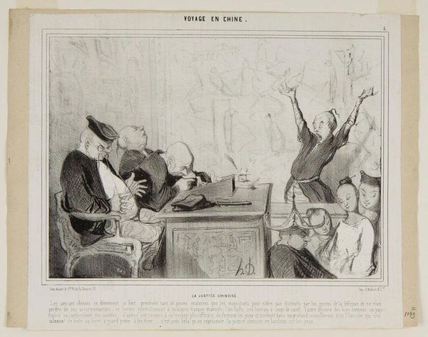 This lithograph, "La justice chinoise", was made by Honoré Daumier in 19th-century France. It's a great example of how printmaking could convey potent social commentary. Daumier was a master of lithography, a process that involves drawing with a greasy crayon on a stone, then using ink to create multiple impressions. This technique allowed for relatively quick reproduction and dissemination of images, making it a powerful tool for political satire. In this case, Daumier wields it to critique French perceptions of Chinese justice. Look closely and you’ll notice the judges and lawyers are barely awake. The image is rich with detail; notice how Daumier uses simple lines to suggest complex emotions and power dynamics. The choice of lithography as a medium is important here. It reflects the rise of mass media and the increasing circulation of images in the 19th century, the same processes of industrialization and capitalism which underpin the colonial project in Asia. Daumier’s print invites us to consider the labor involved in creating and consuming images, and the ways in which art can both reflect and shape our understanding of the world.