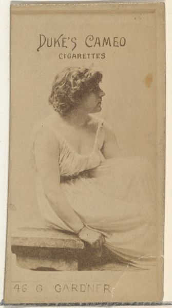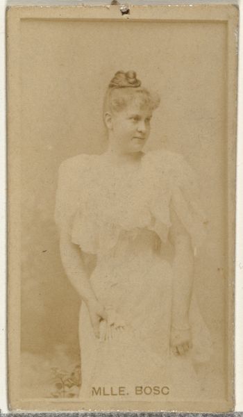Editor: Here we have a vintage albumen print from 1890 by Kinney Brothers, titled "Sallie Randall, from the Actresses series." It feels both intimate and staged, like a glimpse into another era's construction of femininity. What do you see in this piece, especially considering its origins in tobacco advertising? Curator: What immediately strikes me is the complex interplay of capitalism, representation, and the female gaze. Kinney Brothers, using actresses like Sallie Randall to promote Sweet Caporal Cigarettes, were actively shaping desires and expectations. The seemingly innocent portrait is embedded within a matrix of power. This era saw a rise in consumer culture; what role did celebrity endorsements play in shaping cultural norms around gender? Editor: It's unsettling to think about the image being a sales tool for cigarettes, but also kind of clever. So, it's not just about showing an actress, but using her image to sell an idea of sophistication, or even rebellion through smoking? Curator: Exactly. This image participates in the commodification of femininity and exploits it for economic gain. Think about the power structures at play. Who benefits from this image? How does it reinforce existing gender roles, or perhaps subtly challenge them? How do you think it might have impacted women working in theater and entertainment? Editor: That makes me consider Randall’s agency, or lack thereof. She's presented as an object, but she’s also participating, hopefully with some compensation. So it becomes a complex transaction involving identity, economics, and fame. Curator: Precisely! We need to look beyond the surface. This photograph reveals intersections of gender, class, and consumerism within the late 19th-century social landscape. Advertising like this did normalize practices that had social impacts. It gives us a lens to reflect on who creates these narratives, and what their effect is. Editor: I never thought a cigarette card could open up such a complex conversation. Curator: By engaging with the social history, we start questioning whose story is being told, whose is missing, and who holds the power. I’m always interested in reflecting on power structures, and how those affect individuals.