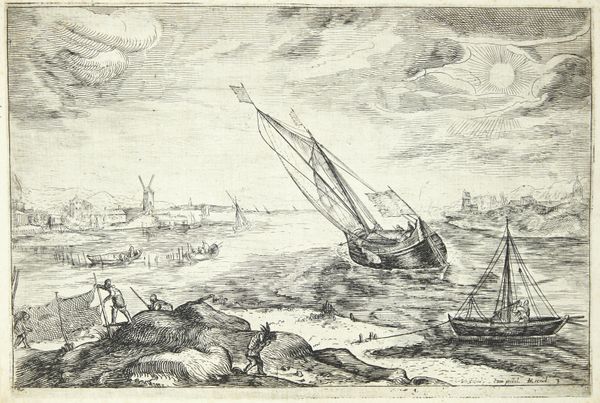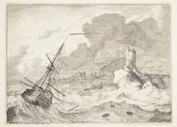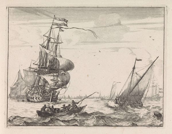 Editor: This is "Ships off the Dutch Coast," a 1701 etching by Ludolf Bakhuizen. It's a bustling seascape filled with ships struggling against choppy waters. The detail is amazing for an etching; you can almost feel the spray. What can you tell me about the story behind its creation? Curator: The "story" inheres not just in what’s represented, but in *how* it’s made and circulated. Consider the print medium itself. Etchings like this weren’t just aesthetic objects. They were commodities, reflecting and fueling the Dutch Republic’s maritime power. Bakhuizen, here, wasn't merely depicting ships; he was participating in an economy of image production. How do you think the rise of printmaking impacted Dutch maritime trade representation? Editor: So, it’s less about artistic expression and more about...Dutch capitalism? How does focusing on the etching itself – the labor, the materials – change our interpretation? Curator: Exactly! Before the 18th Century, there was high demand for etchings that democratized art, beyond wealthy elites who commissioned works of fine art such as oil on canvas, as trade and maritime activity in Holland soared, creating opportunities to commodify these widely-demanded works of art. Editor: I never really considered the role of printmaking as a driver for commerce. Thanks! Curator: And I find myself pondering the lives of the sailors represented in those ships. Perhaps this etching is also a sobering reflection of the human cost of maritime expansion.