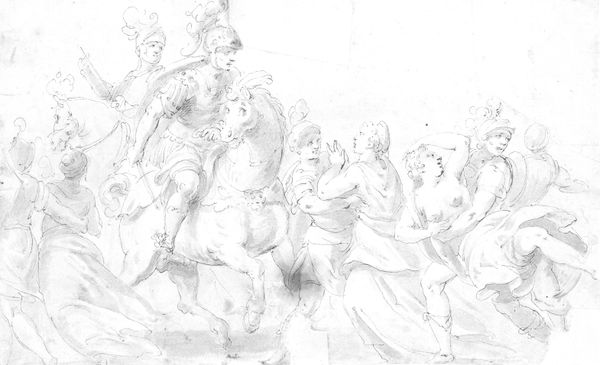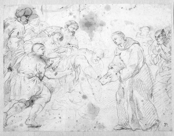 Curator: This intriguing work, titled "Women only," comes to us from the hand of Albrecht Durer, around 1516, and resides at Chatsworth House. It appears to be a pen and ink sketch, though I encourage you to draw your own conclusions about the precise materials and processes involved. Editor: My immediate thought is... chaotic energy! A flurry of figures, lines overlapping, and no real sense of groundedness. It feels immediate, like a snapshot of a very peculiar gathering. Curator: "Peculiar" is a good word. Durer was fascinated by the classical ideal of beauty but also acutely aware of its unattainability. He frequently juxtaposed idealized forms with more earthly, "realistic" figures. Could this be at play here? A contrast between accepted standards and a franker observation? Editor: Perhaps, though I'm equally drawn to the visible labor in the work. The cross-hatching, the quick strokes…it's clearly a study, an investigation of form and composition, made visible in the sketch lines. This isn’t some polished pronouncement; it's the artist *thinking* through making. The choice of pen and ink supports that feeling. Curator: Absolutely. And observe the way the women are positioned in a specific, seated configuration or, we might say, a 'harem configuration', only without the imperial figure traditionally present. As such it can be construed as a subversive statement about their communal experiences together in what would otherwise be assumed as solitude in private spaces. Editor: Fascinating. And the implied domestic setting lends itself to reading this on the same register as other artwork that depicted scenes from workshops or daily activities, in which it highlights their function, skill and contribution. Are they bathing or engaging in other social customs? What exactly are these bodies *doing* together? What actions, what rituals, bind them? The open-endedness makes one think about the conditions for their co-dependence and the lack of labor mobility they have. Curator: Precisely! This is where the power of symbolism resides, its layered capacity for endless reinterpretation, for creating meaning beyond the purely representational. It speaks volumes, quietly. Editor: Ultimately, though, for me, the image lingers because of its materiality – it's about mark-making. That is to say: process over product. Curator: For me, the power resides in that complex layering of potential meaning that only history and context can afford to a work such as this, revealing those shared anxieties. Editor: And those are questions made visible and felt only thanks to that immediacy.