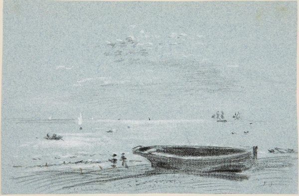 Curator: This sketch, "Figures on the Beach," is in the style of Joseph Mallord William Turner and resides here at the Harvard Art Museums. Editor: It’s so hazy and evocative. The muted tones and indistinct figures almost melt into the sea and sky. Curator: It certainly captures Turner’s interest in atmospheric effects. Consider the social and political context of leisure. Beach scenes like this became increasingly popular as seaside resorts grew in the 19th century. Editor: Yes, and the blurry figures on the beach almost feel like a critique. Are these representations of privileged classes seeking leisure, or are they depictions of the working class seeking solace from labor? Curator: Precisely. The public role of art in this context also involves questioning notions of class, identity, and how societal factors shape these narratives. Editor: It’s a powerful reminder of how art can reflect and refract the socio-political landscape, even in seemingly idyllic scenes. Curator: Indeed, and this sketch, with its historical echoes, speaks volumes about our ongoing conversations around identity and place.