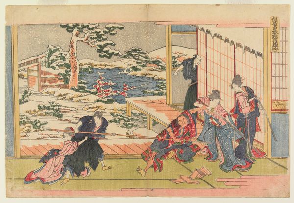 Curator: The work we are looking at is a print titled "Goldfish Vendor," made circa the 19th century by Katsushika Hokusai. Editor: The print feels simultaneously dynamic and calm; there’s a sense of everyday life elevated by a delicate treatment of line and color. The light palette gives it a dreamy feeling. Curator: Hokusai’s pieces like this one give a glimpse into Edo-period Japan, showing the social and cultural rituals of the time, particularly concerning commerce. Note the leisurely pace and the subtle interactions between vendor and client. These scenes gained popularity during this time due to a burgeoning merchant class and increased urbanization. Editor: I am also thinking about the role gender plays here. Look at the three figures. On the right, you have the seated figure wearing several layers, and in the middle you see another woman also lavishly clothed, as opposed to the boy who is not only reaching out in a gesture, but also in less clothing than the other figures. It raises questions about the relationship between class, gender, labor and art. Curator: Exactly. The very materiality of ukiyo-e prints meant they could circulate widely and become integral to consumer culture, solidifying certain gendered and social roles through repeated images. You're seeing it depicted here. And this helped shape Japanese self-perception as well as Western ideas of Japan. Editor: Yes, the reception and the construction of the gaze. Who is invited into this moment, who gets a right to consume the image, and on whose terms? But if we view it as a window into a specific time and space, does that freeze or limit our analysis? The vendor remains timeless while specific to his role within Edo society. Curator: That tension, between the specific and the timeless, is always there when dealing with art of the past. How it reflects the power structures of its day is one thing, but then there's the ongoing way these works function to negotiate identity and meaning now. This piece prompts questions around those issues, don’t you think? Editor: Definitely. It offers us not just a historical artifact, but also a complex text about society, labor, and gender. The way Hokusai captured it allows these dialogues across centuries.