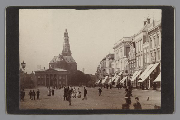 Curator: What a fascinating slice of history! We're looking at a gelatin-silver print by Underwood & Underwood, titled "Gezicht op een markthal in aanbouw in Durban," or "View of a Market Hall under Construction in Durban" created around 1901. Editor: My first impression is the sheer scale of activity captured in this moment. The market hall, shrouded in scaffolding, looms large, while the foreground buzzes with horse-drawn carts and figures. It's a picture of industry and growth. Curator: Exactly. This photograph provides a window into Durban during a period of rapid development. The building represents the optimism and expansion of the city as a major port. Think about what the market itself symbolizes – a convergence point for different cultures and economic activities. Editor: And the scaffolding itself speaks volumes. It is almost an image of an unfinished promise. This skeleton implies transition but the architectural elements such as the twin cupolas, already have connotations of colonial solidity. Curator: Those twin cupolas are interesting, aren’t they? They give a sense of civic aspiration, a deliberate echo of European architectural styles to project permanence and… perhaps dominance. The image might serve as visual rhetoric. The market under construction as a promise to a certain segment of the population. Editor: Perhaps there's even a tension there, between the imposed structure and the inherent energy of the marketplace. Look at the blur of the people and carts. All those circular pathways of potential exchanges of produce, labor, gossip, or revolution. Curator: And note that there's so much activity surrounding the hall *before* its completion, showing how integral marketplaces are for societal life. Editor: Agreed. In this way it acts as an iconographical blueprint, overlaying commerce upon native and colonial exchange. Curator: This photograph invites us to consider Durban's evolution as a hub in South Africa’s complex colonial landscape, and the social structures inherent to any construction of “place”. Editor: Precisely. A market hall is never *just* a market hall; it's a vessel of values, traditions and a vision of the future imposed over whatever came before. Curator: Seeing all this growth also encourages us to critically examine the perspectives and impacts behind it. Editor: Definitely something to reflect on after looking at such a multi-layered image!