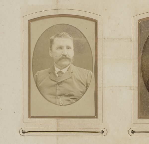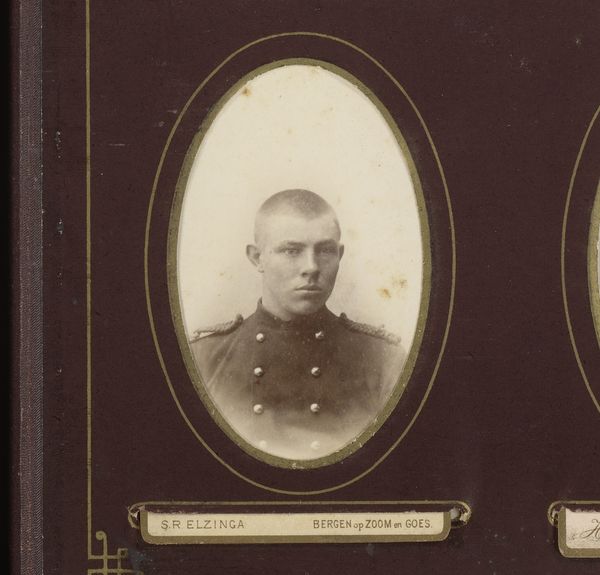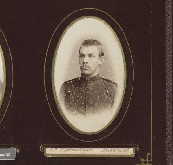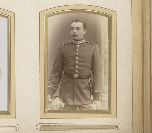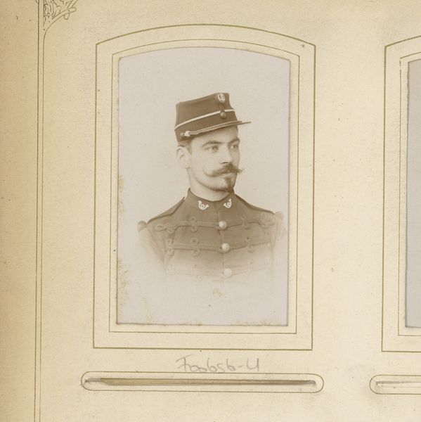 Editor: This is a fascinating photograph titled "Portret van een onbekende jonge man in militair uniform," or "Portrait of an Unknown Young Man in Military Uniform," taken around 1886-1890. It’s an albumen print. I’m struck by how ghostly and ethereal it appears, despite being a military portrait. What symbolic weight do you think such portraits held at that time, and how might that resonate, or not, with us today? Curator: The ghostly quality you observe is intriguing, because it hints at the ephemerality of life even within the structured rigidity of military life. Albumen prints, popular then, now often carry a sepia tone and slight blur, lending an air of the past. Militaries and their members held specific places in cultural and political memory, and were sometimes regarded as patriotic figures of virtue; this photographic trend may indicate the psychological value attributed to it by broader audiences.. Editor: Psychological value? Could you expand? Curator: Well, consider the visual language: the uniform speaks of duty, but the soft focus, almost dreamlike, complicates that stoicism. Perhaps, this was about imbuing photographs of servicemen, such as our unknown man, with a timeless, perhaps idealized, sense of patriotic or heroic presence. His identity remains obscure; he stands in for countless others, creating both individual likeness and archetypal military representation. Does his anonymity add power to the symbol? Editor: Absolutely. He becomes less a person and more of a symbol representing the military institution. It really speaks to the power of portraiture and its capacity for complex meanings. I hadn't considered those layers of anonymity and cultural aspiration before! Curator: And the albumen print’s inherent aging enhances this further. The symbolic strength isn’t just in the subject, but embedded in the medium’s inherent transience, asking: what is the cost of this man’s, and others', patriotic value to others at his expense?