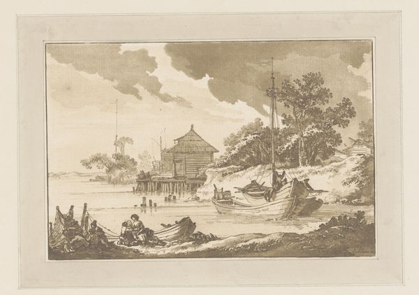 Editor: Here we have "Groep figuren kokend in de buitenlucht," or "Group of figures cooking outdoors," a 1769 etching by Jean Baptist Leprince. It’s printed in ink on paper. I’m struck by how simply rendered it is, and how much information is conveyed with such limited detail, using mostly line work. What do you make of this, looking at its formal qualities? Curator: The first element that arrests the eye is the balanced asymmetry achieved through the strategic placement of light and dark masses. Note how the dark density of the trees on the right mirrors, in visual weight if not in precise form, the shadowed areas around the buildings to the left. This creates a structured dynamism. Can you see the progression in tone? Editor: I do, yes! It starts dark in the foreground, lightens in the middle ground where the figures are clustered, and fades almost to white in the sky. Curator: Precisely. Leprince exploits the contrast between these tones and textures. The rustic texture of the log cabin juxtaposes against the finer, more intricate line work that defines the foliage. And how might you interpret the central positioning of the figures? Editor: It almost creates a sense of theater, doesn’t it? They're framed by the cabin and the trees. Their placement emphasizes their centrality to the composition and therefore, perhaps, to the narrative itself. Curator: An astute observation. It brings attention to how Leprince has employed form to evoke both visual and conceptual balance, orchestrating a harmonious dialogue between structure and content. And with the Baroque aesthetic embracing drama, Leprince’s theatrical composition seems appropriate. Editor: I see that, I was initially drawn to the everyday scene and that simplicity I spoke of but seeing the strategic composition and structure illuminates much more!