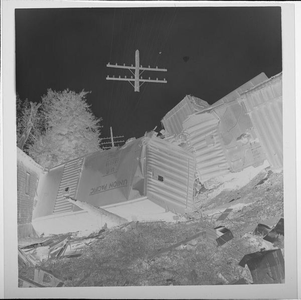 Curator: This intriguing silver gelatin print comes from the Harvard Art Museums. It's an untitled work by Jack Gould, a close-up view of a large tank, measuring only about 5.7 by 5.7 centimeters. Editor: Wow, that tank feels massive and imposing, like some industrial behemoth looming over us. There’s a strange stillness to the image, a kind of quiet intensity. Curator: Indeed. Note the sharp contrasts, the interplay of light and shadow. The composition emphasizes the geometric forms, the rigid structure of both the tank and the wooden supports. The negative space creates a sense of depth, almost a void surrounding these objects. Editor: It makes me think about power, both in terms of physical scale and perhaps the unseen forces these tanks might contain. It's a little unsettling, but also strangely beautiful in its starkness. The wood is a nice contrast to the cold metal. Curator: Precisely. Gould's manipulation of light and form transforms a mundane industrial scene into a study of texture, shape, and the poetics of industrial design. Editor: It's funny how something so seemingly ordinary can become so compelling through the artist’s eye. I see it in a whole new light now.