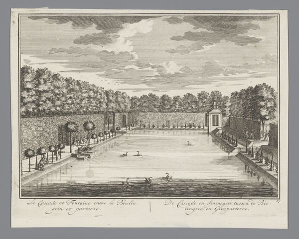 Editor: Here we have Isaac de Moucheron's "Wasserkunst in einem Park, in der Mitte ein künstliches Felsentor mit einem Neptun, rechts auf dem Teich eine Gondel," or, "Water Art in a Park, in the Middle an Artificial Rock Gate with a Neptune, to the Right on the Pond a Gondola". It’s rendered in ink, pencil, gouache, a drawing of baroque style… It's all rather monochromatic, almost ghostly. What strikes you when you look at this piece? Curator: Notice how the architecture and nature are equally represented. The artificial rockwork, the precisely placed gondola – they all point to the deliberate manipulation of the landscape by the aristocracy. This wasn’t just about aesthetics, but also about demonstrating power through controlling and consuming natural resources and the labor involved in constructing such elaborate scenes. Editor: So, it's about the labor of controlling nature? Curator: Precisely. Consider the materiality itself - the ink, pencil, gouache. These were manufactured materials, bought and used for the specific purpose of representing this constructed reality. Even the act of drawing, the skill and labor Moucheron invested, reinforces the hierarchy being depicted. It translates the physical labor of creating the garden to the artistic one, each mirroring the other's purpose. Editor: So, it’s not just a pretty picture of a park. Curator: Absolutely not. The drawing becomes a record, and perhaps even a celebration, of a specific type of consumption and power. Can we truly separate the aesthetics from the economic realities they reflected and perpetuated? Editor: I never thought about the materials themselves in that way. The deliberate choices highlight social stratification and production. I’ll definitely see landscapes differently now. Curator: That's precisely the aim - to look beyond the surface and see the complex relationships embedded in the art's very creation and representation.