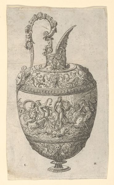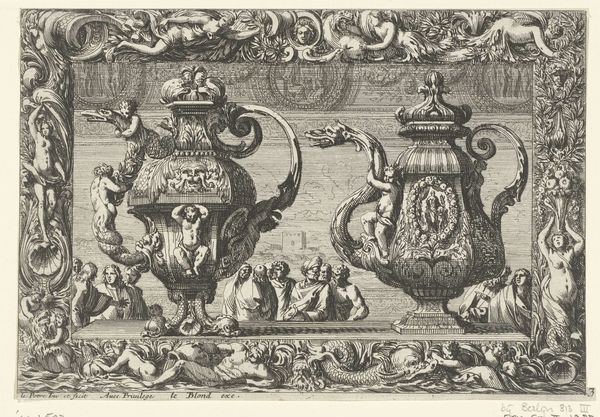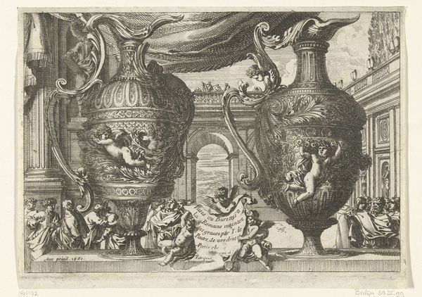 Curator: Here we have "Schenkkan en vaas," an etching and engraving on metal, dating back to between 1657 and 1661, currently residing at the Rijksmuseum. Editor: The contrast is striking! It's like a still life fighting to contain a bacchanal. A really energetic arrangement of linear forms—a visual feast, or perhaps more accurately, a compositional game of chess. Curator: The artist uses dense lines to describe volume and ornate detailing on both vessels, typical of Baroque aesthetics. Observe how the negative space is minimized to maximize detail and create a sense of abundance and luxury. Editor: I'm intrigued by how classical figures and narratives have been worked into the surface of the jugs themselves. They’re symbols of prestige, clearly, referencing classical antiquity and adding layers of learned meaning. It also begs the question as to who may have actually purchased such luxury items at the time, and what they would signify for their owners. Curator: I see a duality in the use of architectural forms and draped figures behind the vessels that lend structural balance—which might further serve the primary intention to make and then sell these metalworks using engravings. The use of light and shadow is calculated to highlight form over overt emotion. Editor: Yet that angel on the left-hand vessel with those powerful wings—a visual representation of elevation—that draws me in. One can't help but get drawn into such classical idealism, regardless of the item’s presumed intended usage. These jugs act almost as little temporal vessels themselves, carrying history onward through symbolism and time. Curator: A wonderful perspective on what may simply be an elaborately crafted advert for extravagant metalware. We've examined the art for its design merits and narrative potential! Editor: Indeed. From a visual pitch to layered meanings…a productive synthesis.