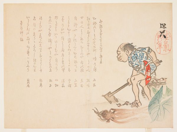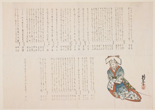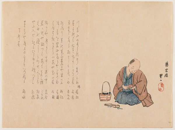 Editor: Nakajima Raisho's "Tea Ceremony," created in 1824 using ink and print, depicts a genre scene with figures engaged in a tea ceremony. The calligraphy dominates half the image; I'm immediately drawn to that textual element. It gives it a sense of ritualized documentation alongside the visual depiction of the ceremony. What stands out to you in this piece? Curator: Let's consider the materiality. We see ink, paper, and the carved woodblocks used for printing, all of which speak to a specific social context and the means of production. The *ukiyo-e* tradition challenges our assumed categories. Is it drawing, print, or something else entirely? What labor was involved to create it, and for whose consumption was it intended? Editor: That’s interesting. I hadn’t thought about the production side of it so much, but now that you mention it, the woodblock print aspect highlights a sort of accessibility—or perhaps intended accessibility? Curator: Precisely. The repetitive nature inherent in printmaking democratizes art production by disrupting unique 'aura'. It brings art closer to craft. Think about who would have owned this. Would it be an individual patron or merchant wanting to be depicted with educated men? Who controlled the resources to produce and distribute it? Does the calligraphy have a relation to those in the visual space or not? Editor: So you're suggesting it might tell a story about class and access? About how cultural practices and knowledge are being represented, and potentially consumed, at this time? Curator: Exactly. The artwork transcends just the 'ceremony' and hints at the broader material culture of the time and class dynamics in Japan. Editor: It is a new way to view a "traditional" piece, reflecting on all the labor and layers within, instead of pure aesthetics or history. Curator: Exactly, understanding the labor behind such an artwork offers great insight into the social values it once upheld.