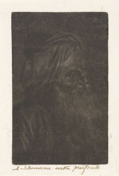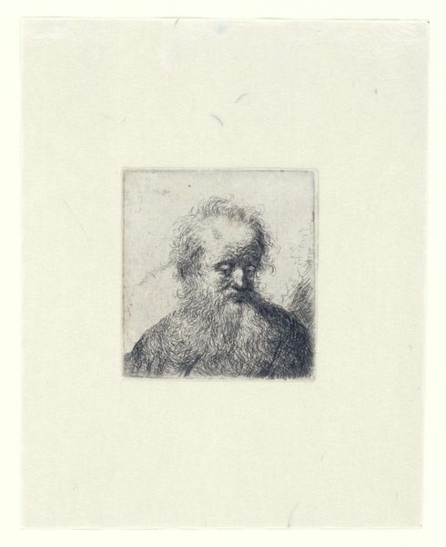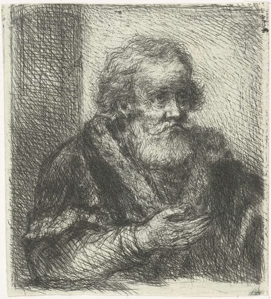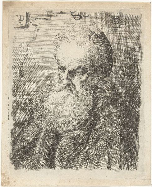 Editor: Here we have Jan Lievens' etching, "Bust of an Old Man with a Long Beard," dating somewhere between 1625 and 1674. The sheer amount of line work creating shadow is striking, and the figure has a real sense of weight and melancholy. What do you see in this piece? Curator: Beyond the striking visual aspects, I see a portrait deeply embedded in its socio-political context. Think about the Dutch Golden Age. What did it mean to depict an aging man, likely not of nobility, with such gravity? It pushes against the idealized portraiture often reserved for the wealthy and powerful, wouldn't you agree? Editor: Definitely, there is an egalitarian quality to the image. So, what does situating this etching within the social context of the Dutch Golden Age reveal about its meaning? Curator: We need to consider class, power, and representation. This wasn’t a commission. Lievens chose to depict this subject. Why? Was it a study of human emotion? Or perhaps a silent commentary on who deserves to be memorialized through art? I wonder, what identities might have been intentionally excluded at the time, and does this etching provide an opportunity to revisit the past with greater equity and inclusion? Editor: It's almost subversive, giving dignity and permanence to someone likely considered insignificant. Do you see the use of etching and its reproducible nature amplifying its message of representation, potentially? Curator: Precisely. The relatively accessible medium democratizes the image. It allows for broader distribution, disrupting the elite control of visual narratives and posing pertinent questions of who gets to participate and who is remembered. Editor: So, seeing it not just as a portrait, but as a statement about societal values in the Dutch Golden Age adds new layers. It definitely pushes the boundaries of traditional art historical narratives. Curator: Exactly. This work reminds us to consider art's agency, questioning whose stories are told and whose remain unheard.