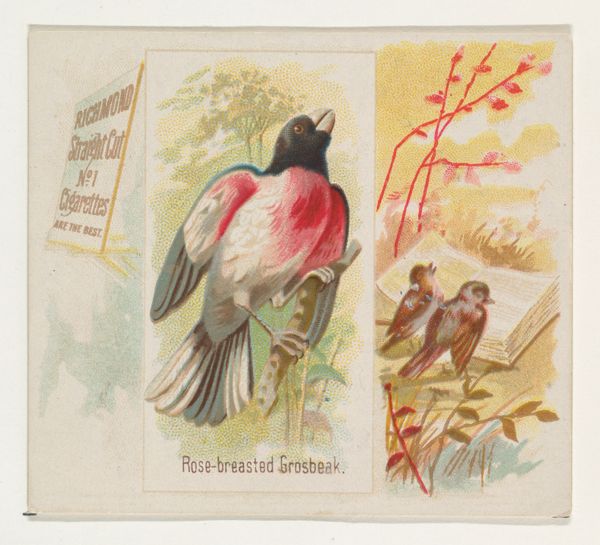 This is "Java Grosbeak," from the Song Birds of the World series, a late 19th-century lithograph by Allen & Ginter for their cigarette brand. The composition divides into three distinct vertical panels. The leftmost panel is dominated by an advertisement, while the central and rightmost panels feature images of the Java Grosbeak. In the central panel, the bird clings to a branch, its form rendered with soft, blended colors, offering a contrast to the flat planes of color elsewhere. In the rightmost panel, the bird sits in a nest set against an abstract background of pale vertical lines. The lithograph’s structural arrangement is defined by clear spatial divisions. This segmentation, paired with the overt advertising message, underscores the piece’s commercial function. Yet, the detailed rendering of the bird introduces a naturalistic element. The juxtaposition of industrial advertising with the delicate depiction of nature highlights the cultural tensions of the period. The image's structure invites us to consider the constructed nature of both commerce and our understanding of the natural world.