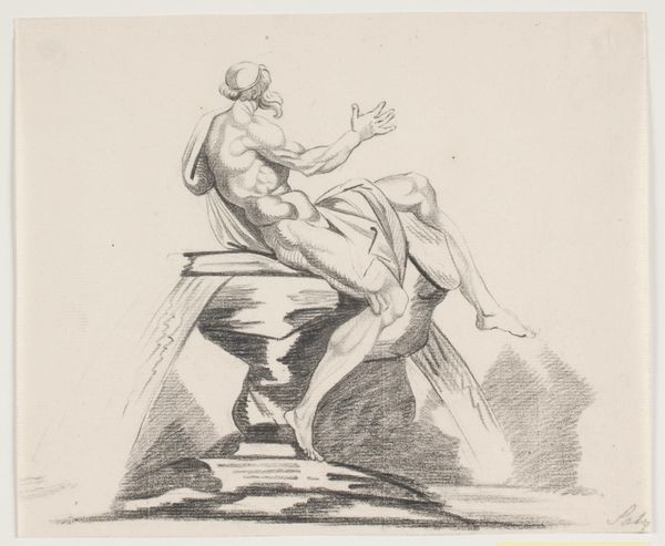 Editor: Here we have Jacques François Joseph Saly’s "Male bearded figure with robes seen in profile, etc. on a fountain," created sometime between 1717 and 1776. It’s a pencil drawing, and what immediately strikes me is the dynamism achieved with such simple materials. What elements of its formal construction stand out to you? Curator: Note how Saly's employment of line, specifically through hatching and contouring, creates not only volume but also directional force. The figure’s upward gesture, balanced by the cascading water, manifests a dialectic of stasis and kinesis. Consider the deliberate juxtaposition of textures – the smoothness of the skin against the rugged, roughly sketched rock. Editor: It’s interesting you point out the balance. I was so focused on the upward motion that I didn’t fully appreciate the downward pull. Is that tension a key element in understanding its meaning? Curator: Precisely. The composition prompts an analysis of oppositions. One must deconstruct the structural framework. Note the interplay of light and shadow that creates spatial depth, but also note how the very notion of spatial recession is simultaneously asserted and negated by the flatness of the picture plane. How might we interpret this tension? Editor: It seems like the artist is purposefully playing with our perception, drawing attention to the artificiality of representation itself. Curator: Precisely. This self-awareness is not merely decorative; it foregrounds the artifice inherent in the creation of idealized forms. We might analyze the inherent contradictions of representing such forms on paper using pencils. This subverts its surface representation to find a new reading, one that exists deeper within the formal qualities. Editor: That’s fascinating. I’ll definitely look at it differently now, focusing more on the contrasting elements and the artist’s awareness of the medium itself. Curator: Indeed, the artist uses classical vocabulary not to represent or replicate the world, but to call attention to it, constructing meaning within it and pushing it, elegantly in the process.