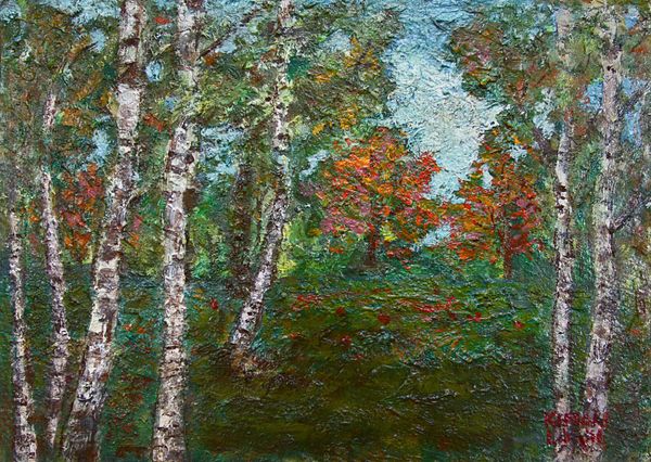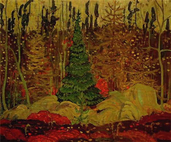 Editor: This is Marsden Hartley’s “Maine Woods,” created around 1908 using oil paint. It’s a fascinating, almost dizzying portrayal of the forest. It feels dense, almost claustrophobic, but the vibrant colours are undeniably captivating. What catches your eye in this work? Curator: What I find compelling is how Hartley, in "Maine Woods," captures a very specific moment in the American art world – a moment where artists are wrestling with European modernism and trying to define an American identity. The gestural brushstrokes clearly draw on Fauvism and early Expressionism, movements embraced in Europe. But the subject – the Maine woods – stakes a claim to something distinctly American. How do you see this tension playing out in the painting? Editor: I guess I see it in the subject matter. The way he renders the forest is more like a feeling of it, an emotional reaction, than a photo-realistic image. So, it's a specifically American place filtered through a European lens? Curator: Precisely! And it raises questions about cultural dominance, doesn’t it? Is Hartley truly capturing the “Maine Woods” or is he filtering it through the lens of a European artistic sensibility that was being promoted by major art institutions and galleries at the time? Think about who was deciding what "good" art was back then and where were they based? Editor: So, it's almost like Hartley is speaking in an artistic language learned abroad to describe his native land. I never really thought about it in terms of that kind of cultural dialogue before. Curator: Exactly. Considering that context helps us move beyond merely admiring the vibrant brushstrokes to considering the public role of art and the politics embedded in even the simplest landscape. Editor: That’s a really interesting perspective. I’m definitely going to be thinking about that tension – the American subject viewed through an external lens – next time I look at this piece. Curator: And hopefully it encourages you to consider how museums and galleries, even today, shape our understanding of art and American identity.