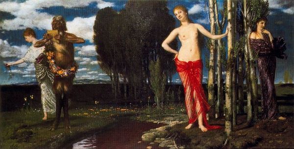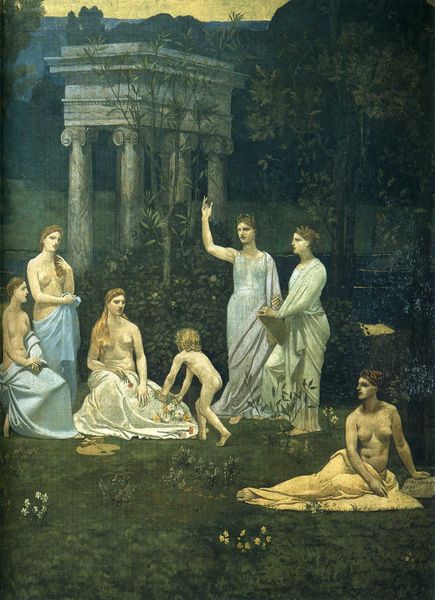 Curator: Here we have Pierre Puvis de Chavannes' "The Sacred Wood Cherished by the Arts and the Muses," created in 1889 using tempera and gouache. It strikes me as an idealized space. What are your initial thoughts? Editor: The pale, muted tones create a sense of tranquility, almost dreamlike. What do you see in this piece? Curator: Well, considering the social context of the late 19th century, this work becomes very interesting. The materiality of the tempera and gouache – often associated with preparatory sketches and craft – elevates the “sacred wood” out of the heavy industrialism of the time. It also challenges the hierarchy of art materials. De Chavannes seems to suggest that spiritual and artistic enrichment wasn’t exclusively the domain of high art, produced with costly materials. Editor: That's a good point! I hadn't considered how the materials themselves play into the meaning. The choice to use these readily available, more accessible media...is he perhaps democratizing the artistic experience, or at least, pointing to where it truly springs from? Curator: Precisely. By depicting the muses amidst these figures, seemingly ordinary in their classical garb and setting, doesn’t he challenge the notion of divine inspiration as something exclusively reserved for the elite? It implies creativity is born from simple, tangible resources accessible to many. How does this relate to labour, materiality and consumption of arts, compared to paintings of the time? Editor: Thinking about production, paintings at the time tried to hide any trace of labour, while "The Sacred Wood" is honest in its technique. The painting favors matte pigments; therefore it does not allow the spectacle of the market, it becomes anti-consumption. I can see this would allow for a more equitable access to arts and its labor... Curator: Yes, this work questions the value system that was being produced and reproduced in academic art practices. It invites us to rethink these relations as well. What will you be taking away from today? Editor: This painting demonstrates how materials and artistic practices, not just subject matter, can carry significant meaning, especially when examined within their specific historical and social contexts. Curator: Indeed. A great starting point to question existing paradigms!