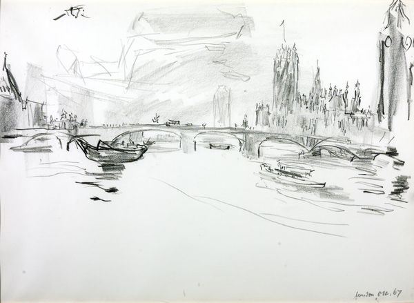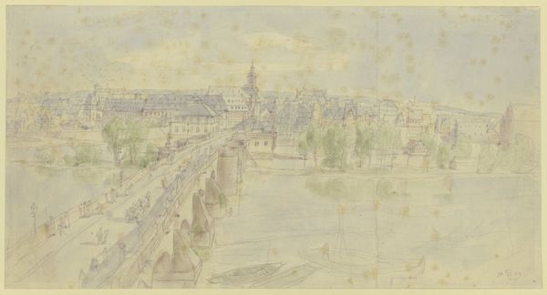 Editor: So, this is "Udsigt fra Gl. Strand over Højbro til Børsen," or "View from Gl. Strand over Højbro to the Exchange," a pencil and ink drawing done in 1845 by Martinus Rørbye. I'm immediately struck by how this quick sketch manages to evoke such a vivid sense of place; it almost feels like a memory being formed. What are your initial impressions of this cityscape? Curator: It whispers of captured moments, doesn’t it? A fleeting breath of Copenhagen life solidified on paper. Rørbye was a master of atmosphere. To me, this isn't just a cityscape; it’s a sensory experience. Notice how the delicate lines of the buildings contrast with the heavier strokes depicting the bridge and the bustling activity along the water? Do you sense that visual rhythm? Editor: I do. It's almost musical, a dance between the rigid architecture and the organic flow of daily life. But what about the starkness of the medium? Why choose pencil and ink over paint for such a vista? Curator: Ah, a delicious question! Perhaps immediacy was key. Pencil and ink allow for speed and precision, ideal for capturing a scene before the light shifts or the moment vanishes. Think of it as Rørbye’s visual shorthand, a way of seizing the soul of the city. The choice also allows us, as viewers, to participate, doesn't it? To fill in the colors, the smells, the sounds...What hues do *you* imagine blanketing this cityscape, looking at it? Editor: Hmm, I'm seeing soft greys and muted browns, a very Nordic palette. Thinking about his intent adds so much to the viewing experience. I see something completely different now! Curator: Exactly! Art invites a conversation, and sometimes, the most rewarding dialogues begin with a simple sketch. I will never think of a pencil drawing as being simple ever again.