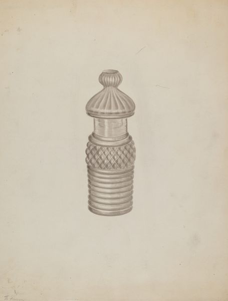 Curator: It feels delicately haunting, doesn’t it? Editor: Haunting is the word. I am captivated by the soft grays. There is a real ghostly presence, like it exists on the periphery of memory. Curator: This lovely pencil drawing, titled "Peg Lamp," was created around 1938 by John Dana. It renders what appears to be a glass lamp component. Editor: Dana captures the play of light on glass effectively. The careful rendering speaks volumes about his material investigation—the facets, curves, the labor embedded in manufacturing this object. Do you agree? Curator: I do, especially since domestic spaces of that era became arenas of societal norms, heavily coded with gender and class expectations. We could ask, how does the choice of rendering a lamp fit into narratives about interiority and gendered labor? Does this portrayal uphold the established norms, or does it subvert them? Editor: Or, even more specifically, what social context of lamp making in the United States during the late 30’s informed the means through which Dana captured the production and circulation of these kinds of goods. After all, electric lighting shifted material needs within domestic sphere and its gendered social constructs. Curator: Indeed. What is fascinating here is that the delicate lines offer a glimpse into broader dialogues that interrogate consumption patterns and their effects on people, relationships, and communities. How might this object—now transformed into a simple drawing—invite new avenues of reflection and social commentary today? Editor: Well, for me it asks, how can close examination of process, material, and means open space to new ways to challenge value attribution, by demystifying how those in positions of social power have been ascribed value. Curator: It reminds me of the importance of excavating and highlighting these seemingly humble objects, for they are really nodes in expansive networks of power and agency. Editor: Agreed. There’s real agency here, even in the humblest pencil stroke.