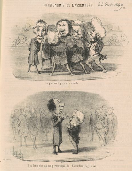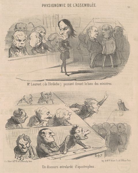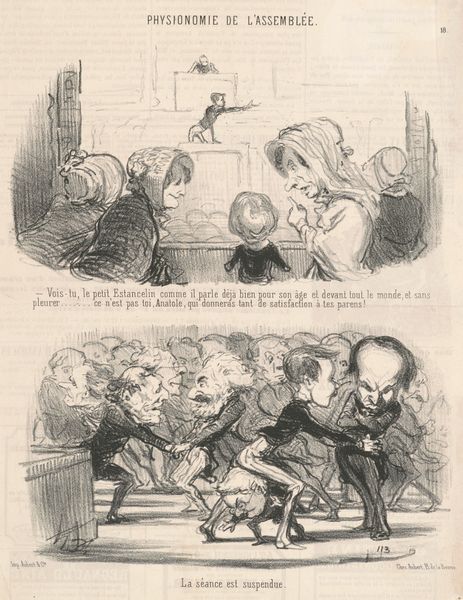 Curator: This lithograph, "Vue de M. Dupin se rendant a l'assemblée", or "View of Mr. Dupin Going to the Assembly", dating to the 19th century, is by Honoré Daumier. Editor: It immediately strikes me as satirical, even grotesque. The figures are so exaggerated, almost nightmarish. Curator: Daumier was a master of social and political critique through caricature. This work captures, in two registers, the performative nature of political life in 19th-century France, offering an implicit judgement of both Dupin and the assembled audience. He captures Dupin, en route to the assembly, followed by musicians as if heralding him and then we also get a glimpse into what occurs *at* the assembly. The contrast is hard to miss. Editor: Absolutely. The procession emphasizes Dupin’s self-importance, his head comically large. Do you think this amplification of features targets Dupin himself, or perhaps the culture of personality in politics more broadly? Curator: Given Daumier's radical republicanism, it's a stinging commentary on the French political landscape following the July Revolution. His critiques consistently challenged the powerful and privileged, and his skill was in linking the micro and macro injustices in the social order of France. In the image, the lower panel illustrates a similarly critical view, portraying those witnessing the events. Do you get a sense that this commentary of his continues to be relevant in politics? Editor: Yes, the spectators in the second scene seem either bored, bemused, or actively repulsed—a harsh indictment of the political class of the time and perhaps our own. Daumier's use of lithography also allowed these images to be widely distributed, fueling public debate. We can draw clear parallels with contemporary political cartoons that challenge authority. His use of the medium, therefore, is deeply embedded in both history and our own present. Curator: Precisely. It's a reminder of art's enduring power to reflect, question, and even shape public perception. Editor: A very relevant perspective, revealing how art intervenes in the narratives of power and politics.