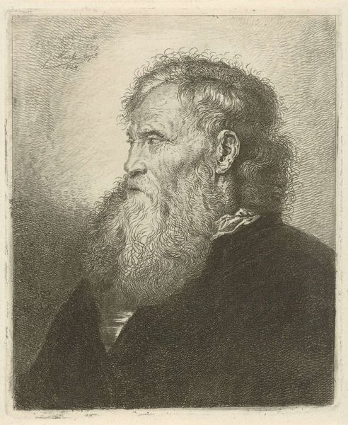 This print, "Oude man met baard," or "Old Man with Beard," was made by Georg Friedrich Schmidt in the 18th century. The medium is etching, a printmaking process that demands real technical skill. The artist covers a metal plate with a waxy, protective ground, then scratches an image into it with a needle, exposing the metal underneath. The plate is then submerged in acid, which bites into the exposed lines, creating grooves. These are then filled with ink, and the plate is pressed onto paper, transferring the image. Look closely, and you can see the subtle tonal variations, the result of Schmidt's control of the etching process. The real subject of this work isn't just the old man himself, but the way that line and texture can be manipulated to create the illusion of depth and form. Schmidt's skill is evident in the way he coaxes a range of effects from a single material. By focusing on the making, we can appreciate the level of craftsmanship involved in creating this image.
