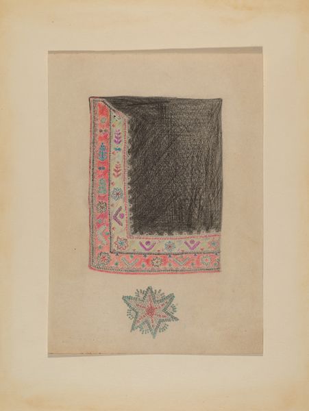 Curator: The quiet simplicity is quite striking, wouldn't you agree? Almost minimalist. Editor: There's a reserved tenderness about this. It feels intimate, like a carefully folded secret. It's identified as "Blanket," made circa 1936 by Mary Berner, a study rendered on paper using watercolour and coloured pencil. Curator: The year interests me, the mid-1930s. This was likely created during the throes of the Great Depression. It makes me wonder, was Berner documenting a cherished heirloom, clinging to memories of more comfortable times, or was this simply an exercise in capturing domestic tranquility in the face of widespread upheaval? Editor: It certainly seems to be referencing a textile of some kind, not an actual blanket, the soft focus of the watercolours, the faint lines. Is this blanket a symbol? A comforting emblem? A reminder of heritage, a symbol of the domestic sphere which had traditionally been coded as female in that period? The geometric pattern feels both homespun and very carefully organized within the larger form of the textile. Curator: Exactly, note the geometry, especially within that central circular design. The intersecting lines almost radiate outward from a hidden centre, reminding me of celestial maps or even mandala patterns. Is it merely decorative or does it reference deeper connections to the earth and cosmos? We know how often textiles encode cultural and psychological ideas of home. Editor: Perhaps Berner is weaving her own narrative into a seemingly everyday object. It certainly reflects on gendered and classed aspects of the 30s: the intersection of practicality and beauty. How these humble materials like watercolour on paper evoke so much, I'm taken by its delicate power. Curator: A convergence, indeed, where social history meets symbolic resonance, a moment caught between quiet domesticity and turbulent historical tides. Editor: It’s certainly granted me a deeper connection to this deceptively plain "Blanket." I will now think more about Mary Berner’s hand, and those quiet times, perhaps now a bit more illuminated.