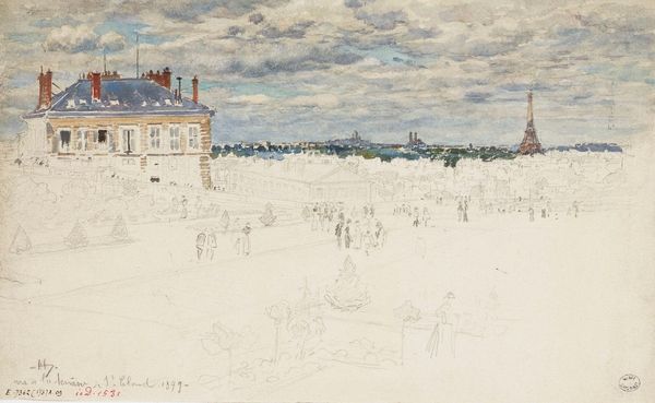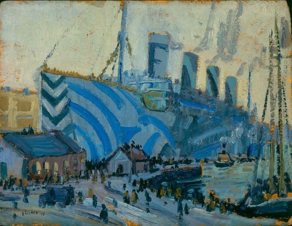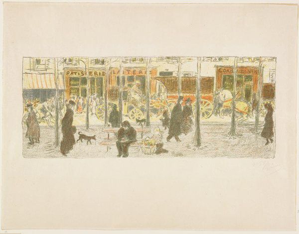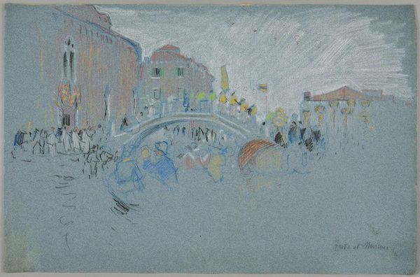 Curator: Scheveningen, by Jules Schmalzigaug... What do you make of this abstract watercolor? Editor: I see a crowd, maybe at a beach? It feels lively but also a bit…chaotic, like a snapshot of a bustling scene. How do you interpret this work? Curator: Beyond the immediate impression, I see an echo of social dynamism and the burgeoning urbanization of the early 20th century. Schmalzigaug was working during a time of intense social and political upheaval. He embraced Futurism. Can you see how he depicts a restless modernity? Look at the architecture juxtaposed against what appears to be a chaotic assembly. Is it simply a landscape? Or something more? Editor: You're right, it's more than just the scene. There's a tension here. The bright colors contrast with the almost frantic brushstrokes. The composition lacks a central point, forcing the eye to wander. Curator: Precisely! This lack of a fixed perspective challenges traditional hierarchies, reflecting a shift in how society was beginning to see itself. Do you see a possible connection with Italian Futurism’s desire to abolish the past? Consider what it meant to depict social activity in this manner rather than a romanticized portrait of an individual, and how that challenges social norms and artistic expectations. Editor: So, this image is more about the energy and the changing social landscape than about the specific location? It sounds like his goal isn't representing a pretty beach, but communicating that societal change. Curator: Exactly. The image itself mirrors that societal shift. Think of it as a visual manifestation of the breaking down of rigid social structures. How fascinating to think that Schmalzigaug was part of an artistic push for radical societal change! Editor: I'll definitely see abstract art differently from now on. Thanks!