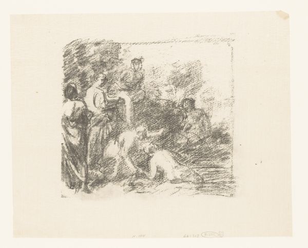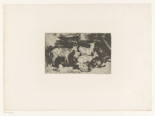 Curator: Welcome. Before us is "Three Goats in a Barn," a drawing and etching by Adolf Eduard Herstein. The work is undated but presumed to have been made between 1879 and 1932. Editor: Stark, wouldn't you say? The composition is remarkably simple, almost crude. It conveys a certain rural atmosphere, perhaps even a touch of melancholy, through its emphasis on light and shadow. Curator: Precisely. Note how Herstein uses the etching technique to define forms, focusing less on pure representation and more on evoking mood. The contrasts are quite striking. How do you view the artist's choices of animal figure for its allegorical implications? Editor: I would posit that it is related to shifts in artistic representation influenced by rapid urbanization and industrial advancement in Europe. Farm animals, particularly goats in their rudimentary confinement, often functioned as both a literal subject but also represented a more sentimental longing for simpler pastoral life. Do you agree with this perspective? Curator: Yes, indeed, one may explore beyond the stylistic choices of contrasting areas in his printed sketches of landscapes in which a turn-of-the-century society was entrenched, also remarking on the relationship of country and city life through their own cultural memory. He invites one to observe how the narrative context transforms familiar elements. The placement of these creatures within a barn allows this seemingly modest drawing and print piece, composed in black ink on paper, to function as more than the representation of an animal herd or bucolic, tranquil image, inviting the audience to a discussion about its meaning. Editor: This piece speaks to how we construct idealized memories from an industrializing present—where "nature" becomes a manufactured concept for social reflection as a sort of constructed refuge from reality. Very interesting. Curator: Indeed, reflecting on the relationship with progress and nature within art opens important societal perspectives that would otherwise be omitted if restricted purely to its artistic qualities. Editor: An engaging commentary then, beyond surface presentation, on our constructed ideas of nature—thank you.